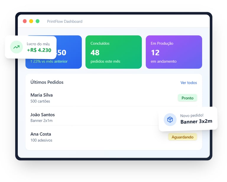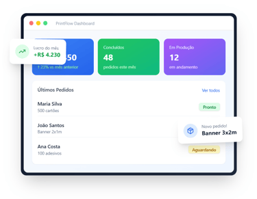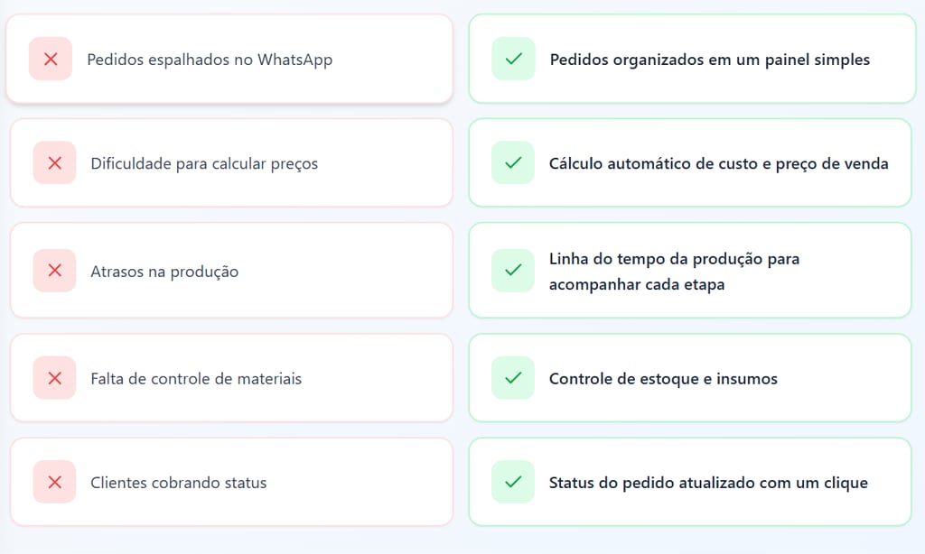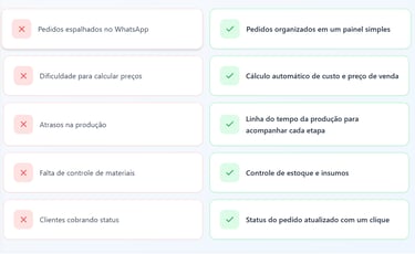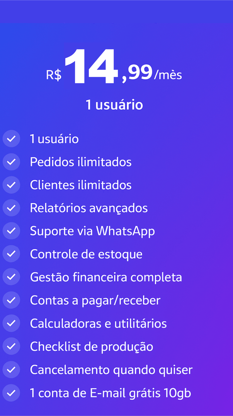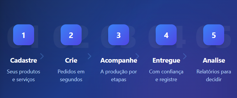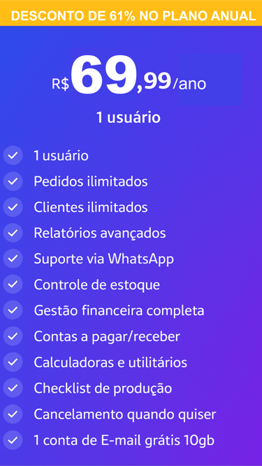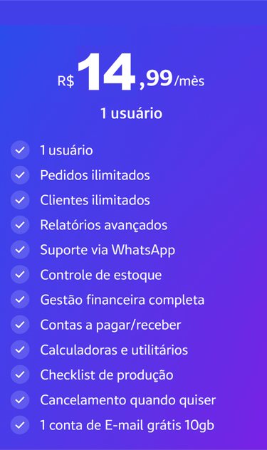 Controle pedidos, calcule custos, acompanhe a produção e entregue no prazo. Tudo em um só lugar.